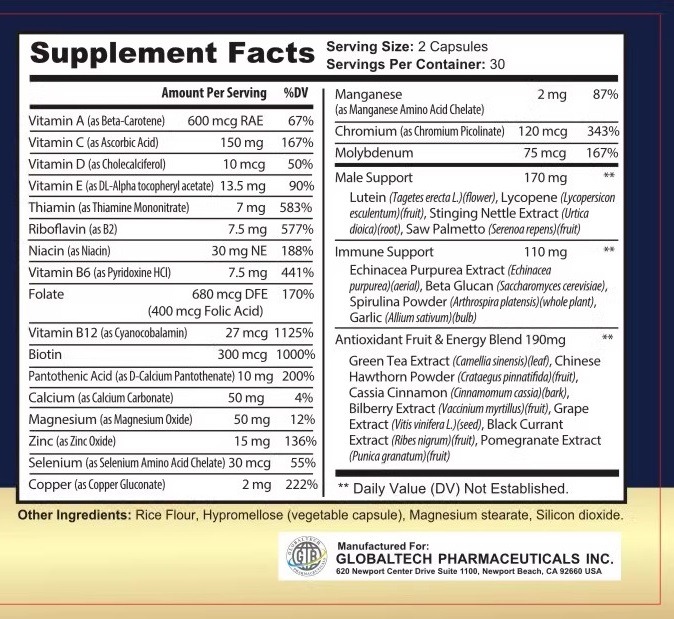 USETH Men's Multivitamin is based on a scientifically-based formula that contains a full spectrum of vitamins, minerals and more to help support a healthy, active lifestyle. This multivitamin is specifically tailored for men to support self-care health, energy and vitality production, help soothe the body, support healthy muscle function, and help prevent dietary deficiencies.